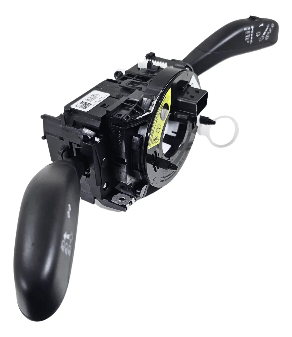 Se trata de una unidad de conmutador (palanca) para el sistema de intermitentes (direccionales) y limpiaparabrisas, diseñada para vehículos Volkswagen Gol y Volkswagen Saveiro de generaciones G6/G7. El componente incluye la palanca ergonómica montada sobre un vástago que conecta mediante mecanismo interno giratorio al conjunto de reloj de muelle (cinta airbag/sensor), identificado con el código original 6R0953501AG. El material principal del cuerpo externo es polímero de ingeniería (probablemente PA + GF) con destellos de textura superficial que coinciden con el diseño interior del volante, y el mecanismo interno contiene contactos metálicos, muelle de retorno y cinta enrollada para el sensor de airbag. La pieza cumple con especificaciones de fabricante para instalación directa (“plug & play”) en los modelos citados.