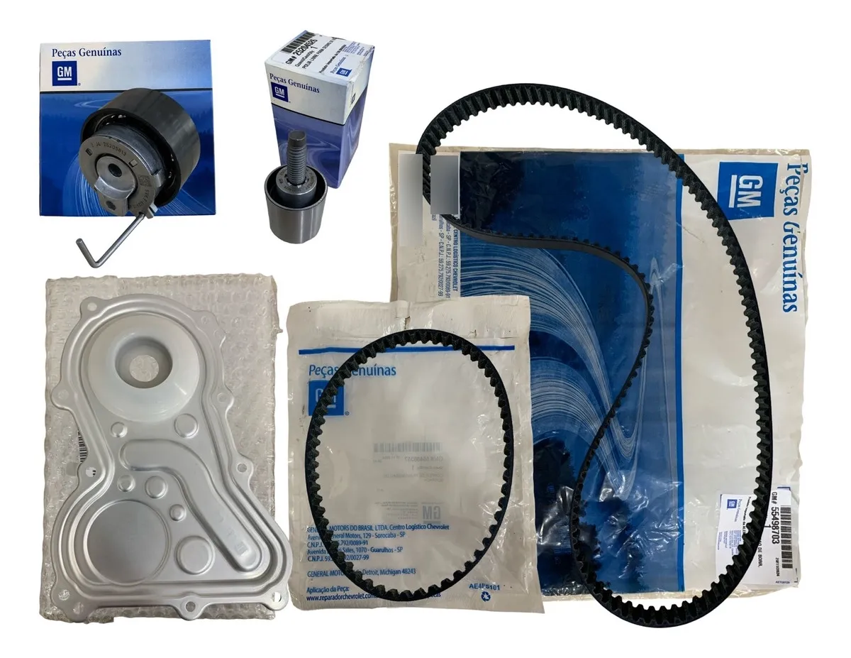 El kit de distribución completo original para la Chevrolet Montana 1.2 turbo (2022–2024) incluye correa dentada, correa de bomba de aceite, tensor, polea guía y retentor/tapa frontal, todo con códigos OEM GM: 55499413, 55486357, 25205813, 25204526, 55509157 (o 55487381 en versiones más nuevas).