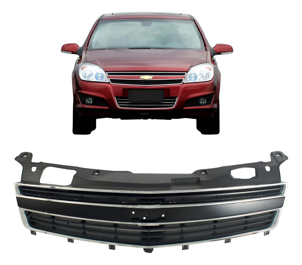 Rejilla delantera para Chevrolet Vectra modelos 2009, 2010, 2011 y 2012, diseñada con estructura central en acabado negro y moldura perimetral cromada. Está construida en polímero resistente a impactos y a la exposición climática, con lamas frontales que siguen la línea del paragolpes y soporte central para emblema. Su geometría respeta las dimensiones y puntos de fijación originales, permitiendo instalación directa en el frontal sin adaptación ni perforaciones, manteniendo alineación con faros y capó.